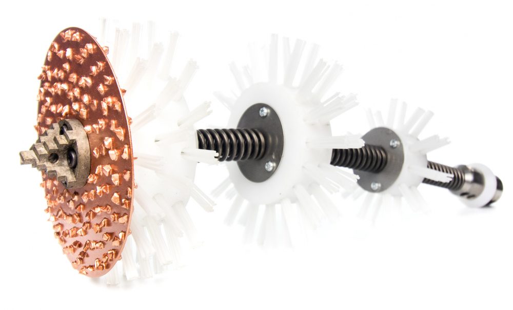 Lateral Cutter (1/2” Shaft). Front Metal Panel: 4.5”, thickness 1mm. (Includes spare 3mm Front Metal Panel). Reinstatements inside clay, cast iron, concrete or plastic pipes. Brushes keep tool centered in the pipe.