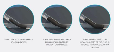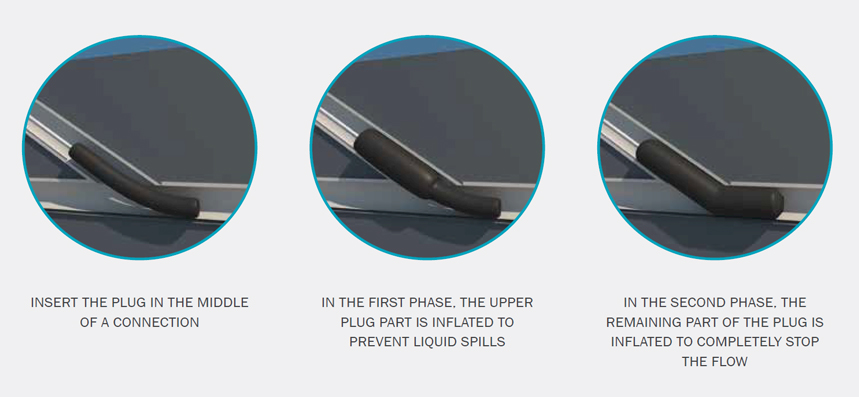 Required inflation pressure 36 psi (2.5 bar). The construction of multi-size long plugs ensures efficient sealing of both connection and the main pipe at the same time. These plugs are equipped with a 39.4-in (100 cm) long supply hose