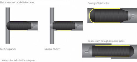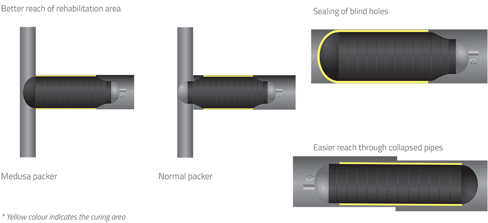 Do you have a repair that needs to be completed at the lateral/main connection? Perhaps your repair is at a Tee or Wye? Medusa packers are specifically designed for point repair installations where other packers place your point repair short of the break. The ends of Medusa packers are made from an extremely flexible soft rubber that simplifies handling of the packer in narrow spaces. Since the Medusa packer end can be pushed closer to the pipe edge, Tee and Wye connection repairs are more efficient.